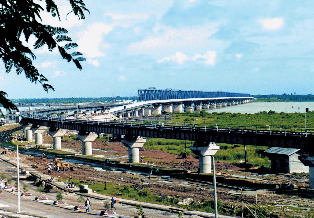 仰光-丁茵鐵路公路大橋項目鐵路橋(含引橋)全長2938.5米,公路橋(含引橋)全長2151.3米,正橋長1822.4米。全橋共有53個墩臺,其中水中墩17個,主體工程混凝土量12.4萬立方米,鋼梁總量18660噸,鉚釘數(shù)量110萬個。項目于1986年10月開工,1993年7月竣工。
